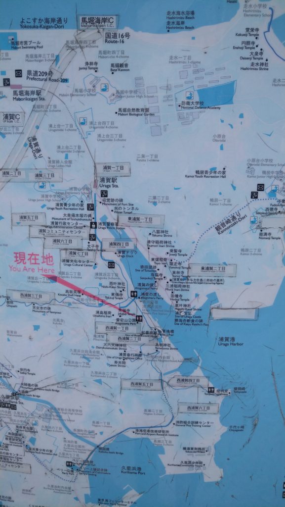 京急で「浦賀行」あるし、「黒船」「ペリー来航」「造船の町」「浦賀水道」…社会の教科書で習った覚えもあり、知ってる人も多いと思いますが、こんな地形の町。