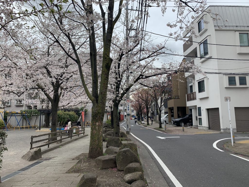 大森駅、環七周辺。満開です。週末が見頃かな。公園には薄いピンク、道沿いには濃いピンクの桜があって綺麗な感じです。