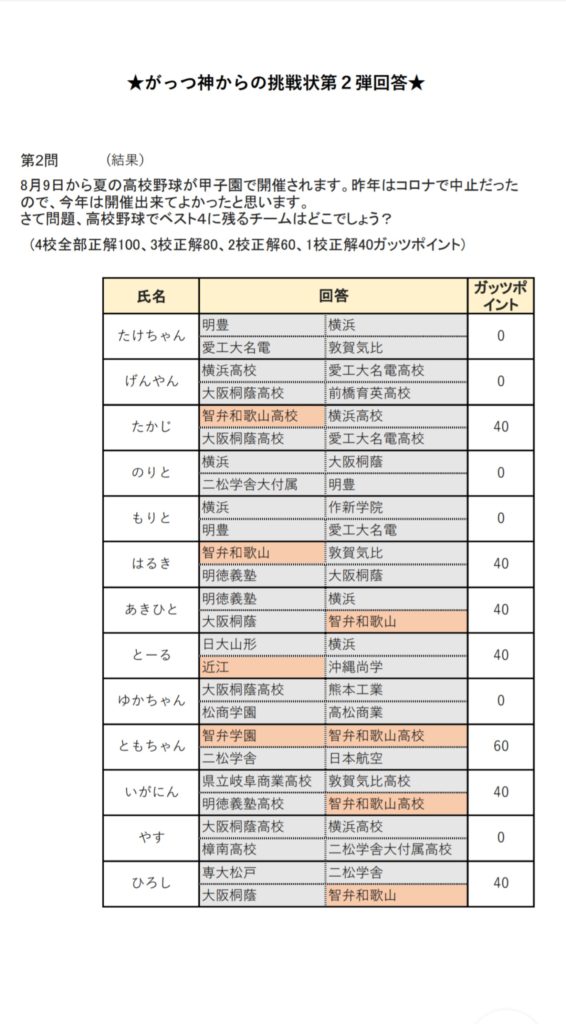 何と!全て近畿地方の高校。これは史上初ということです。ガッツ神からの挑戦状第2弾、2問の結果はこちら!