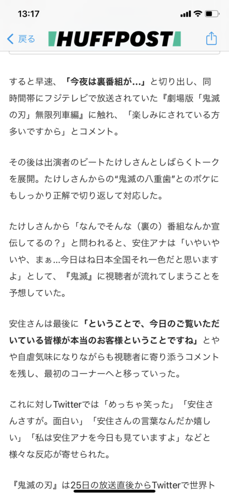 昨日の映画版無限列車がTVでやった裏番組では安住アナとたけしが鬼滅に触れていたそうです。八重歯については、記事を読んでね。安住アナ、正直者ですね。(笑)