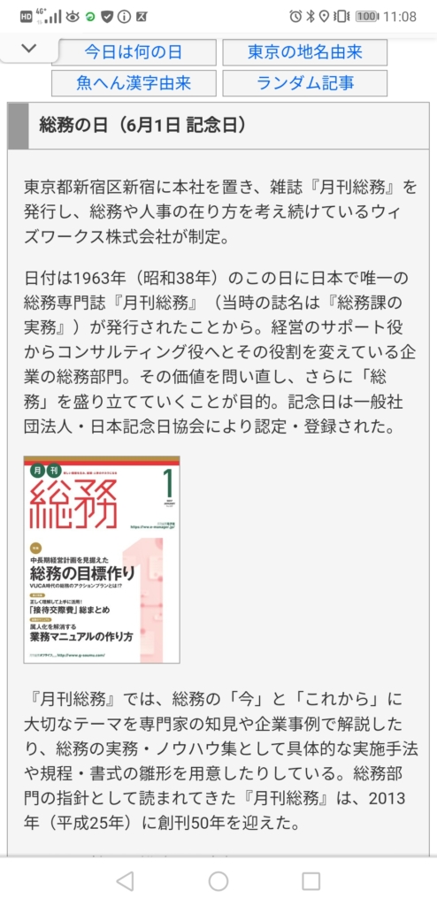 続いては、『総務の日』。これも全然知らないなぁ。雑誌「月間総務」を発行している会社が制定したようです。総務に特化した内容で専門誌を毎月発行しているなんて凄いよね。