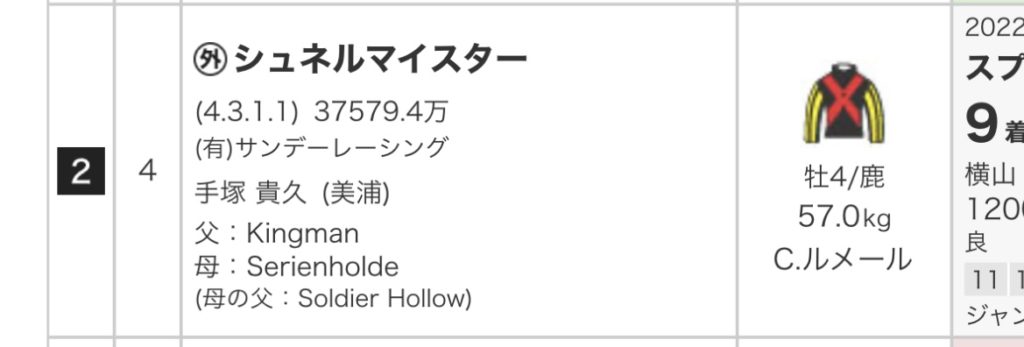 続いてはシュネルマイスター。外国産馬でドイツ産。ドイツ産駒はジャパンカップを勝ったランドが有名ですが、欧州産駒はスピードが求められる日本の馬場は不利と思いますが、この馬はこなせてます。きっと不良馬場でもこなせるはず。