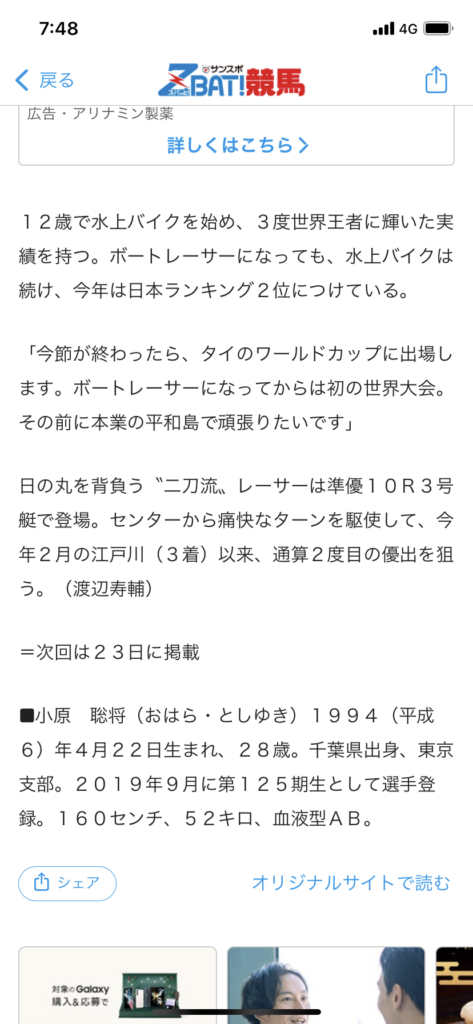 競艇選手です。地元平和島の若手。そして水上バイクで世界一になったことがある選手。過去に3回もだって。