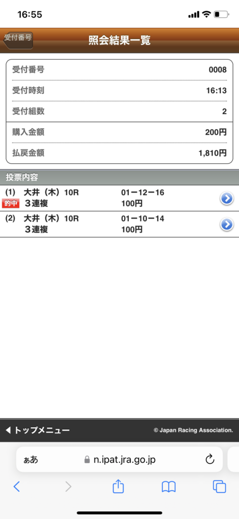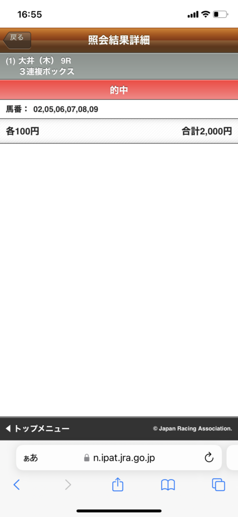 抜けが来て、万馬券とはならず。3番人気で落ち着いたので、トリガミに。二千円買って、半分返ってきた感じ。