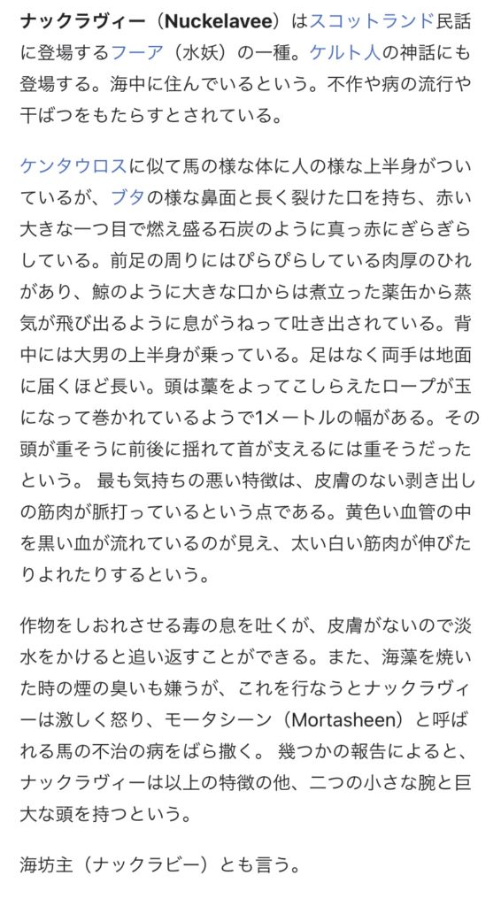 スコットランド民話やケルト神話に出てくる水妖の一種だそうです。日本語だと海坊...