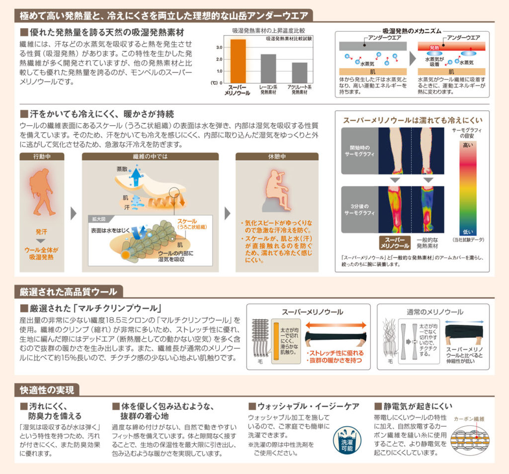 着た瞬間から暖かい、天然の吸湿発熱素材ウールを使用した中厚手のアンダーウエアです。優れた保温性とストレッチ性を備え、日常からスノースポーツまで幅広いシーンで活躍します。