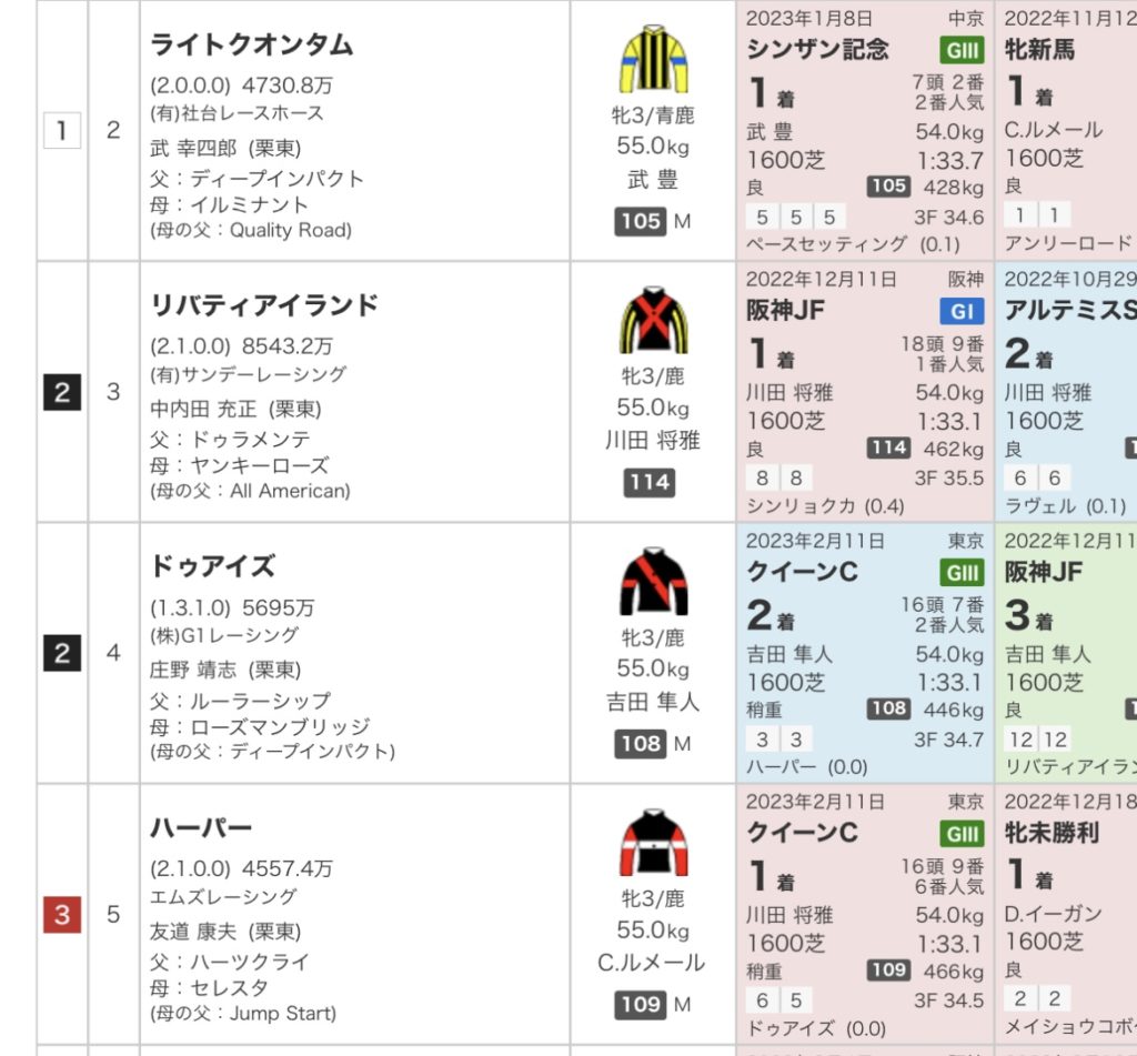 本命はリバティアイランド。マイルなら敵無しだと思います。不安があるならぶっつけ本番で、早熟馬なのか判断出来ない所と悪い馬場をこなせるか?です。