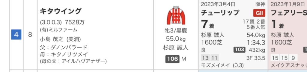 このままだと1番人気から4番人気を選んだだけなのでつまらない。なので重賞2勝しても人気にならない馬を絡めます。キタウイング