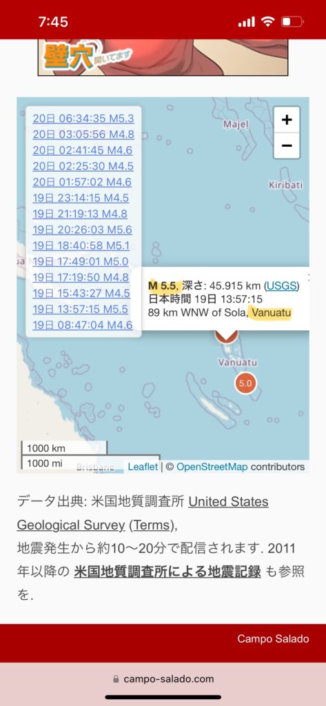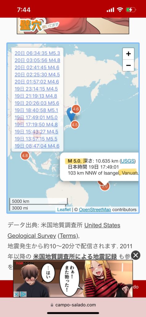 昨日から佐渡沖と千葉、北海道から沖縄まで全てで地震が出始めてます。そんな中で、昨日、バヌアツでM5以上が2回。まじで注意してください。