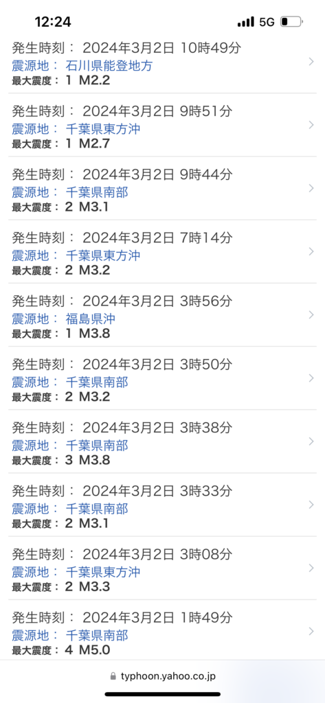 今は能登と千葉が同じような群発地震なので、警戒MAXでお願いします。
