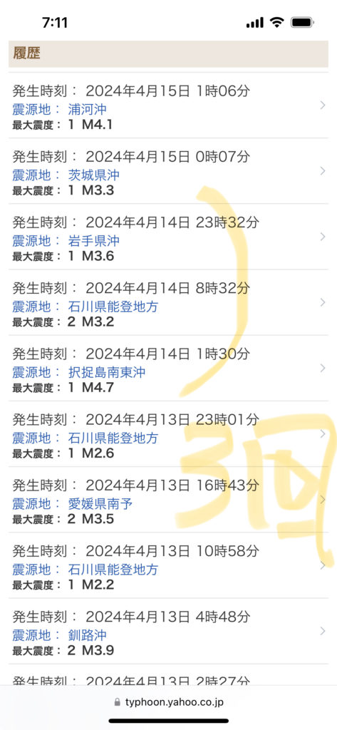 掲示板にも書いたけど、4/14は3回でした。昨夜からおよそ12時間→24時間、有感地震...