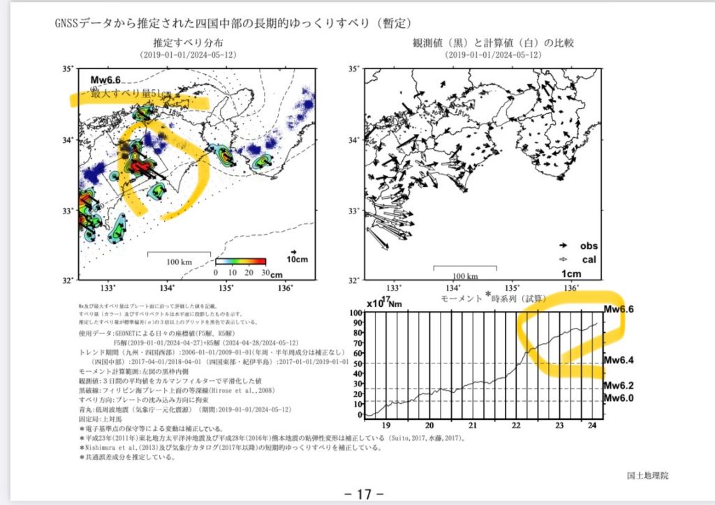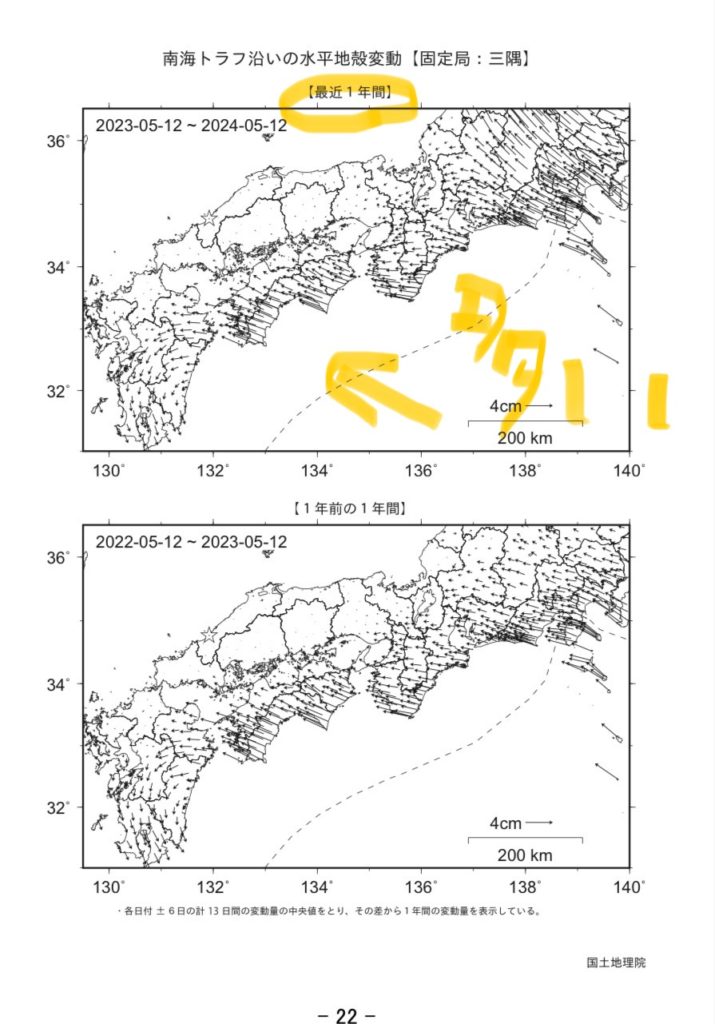 四国は51センチ滑ってて、要は、ここ五年で南東方向に51センチ↑に地面が上がってるわけさね。そして、ここのところの2年ほどで更に進みが早くなってるわけです。↓