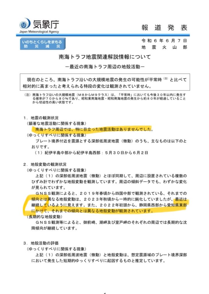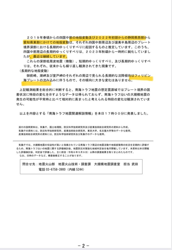 南海トラフは緩やかに滑っており問題ないとの事。