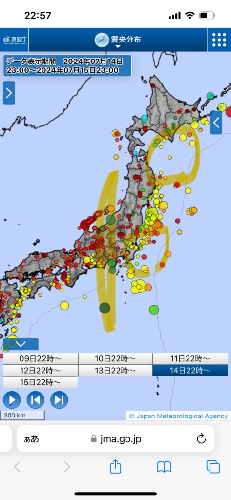 掲示板に書いた内容の補足資料。今日書いたら、千葉、茨城と地震相次いで起こったので。絵で見ておいてください。地震回数0回の翌日ですから、仕方ない。今晩からは深夜も気をつけなきゃだ。