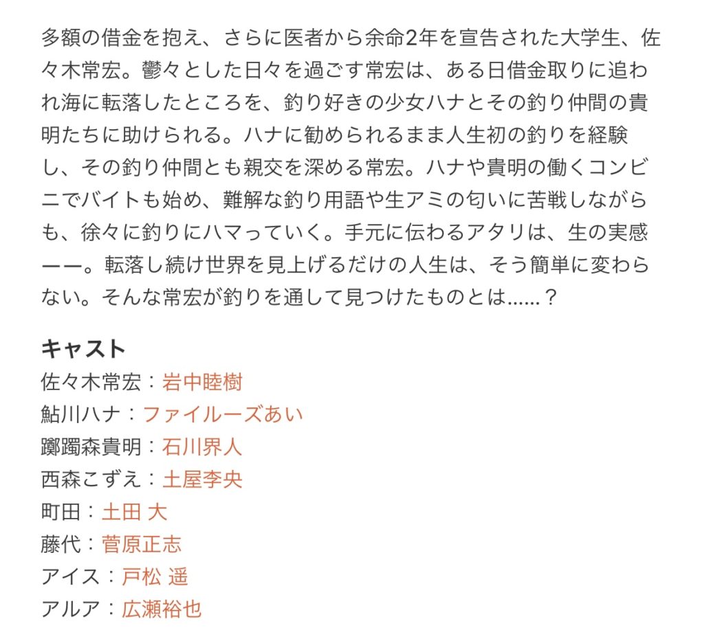 気になるアニメ。余命2年の宣告を受けた大学生が釣りを始める話のよう。