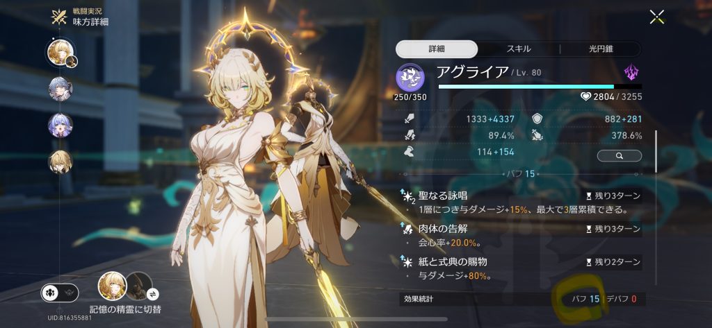 アグライアの通常戦闘時、必殺の🦏のステータス んでもって、階差宇宙でバフが29乗...