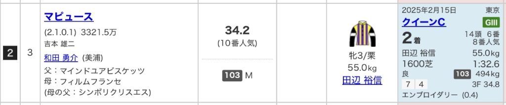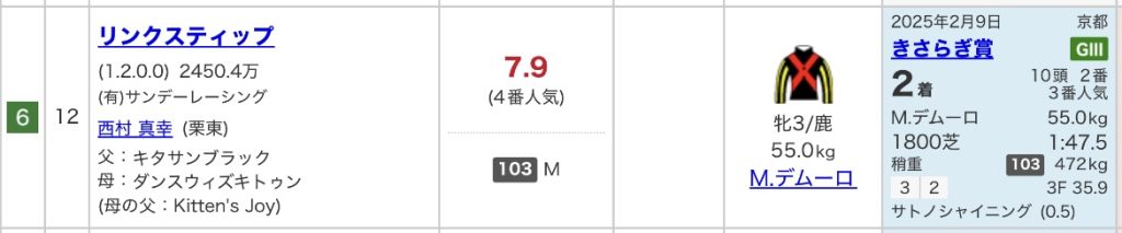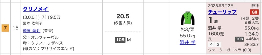 本命はこの馬、クリノメイ。まずテン乗りは外し、勝っているのにそれ程評価されて無く、人気が低い。最近はダートに活躍馬が目立つオルフェーヴル産駒。パワーもあり道悪も苦にならないと予想。