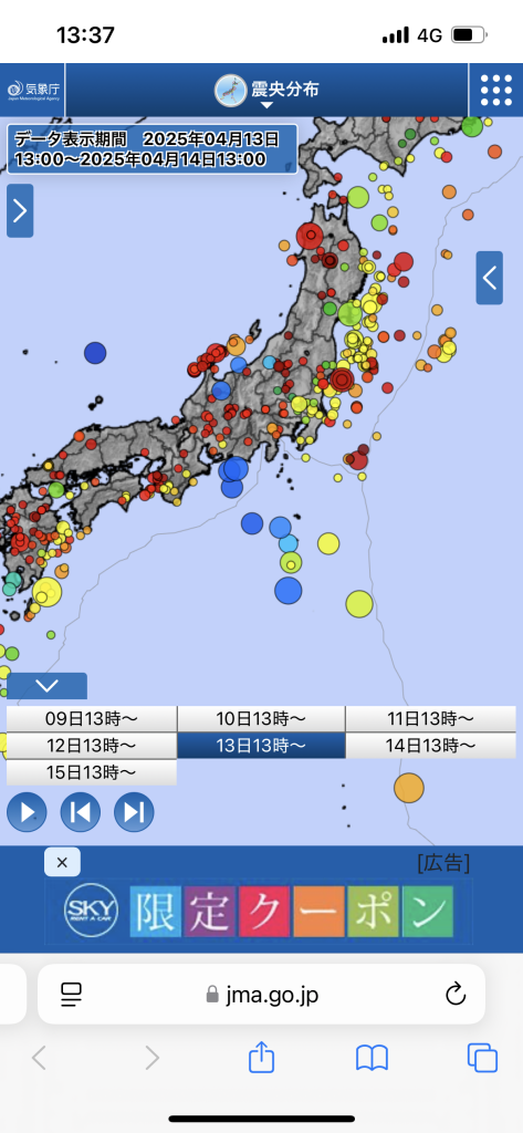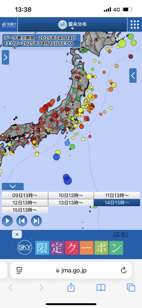 記事にある青丸。やはり太平洋側に青丸増えると大きな地震起こったでしょ。しかも、直線で結ぶと長野あるでしょ。想定内だったので、慌てることはなかったけれども。中央構造線上の地震は西から東へ進む傾向あるので、今はやはり、茨城、千葉注意です。