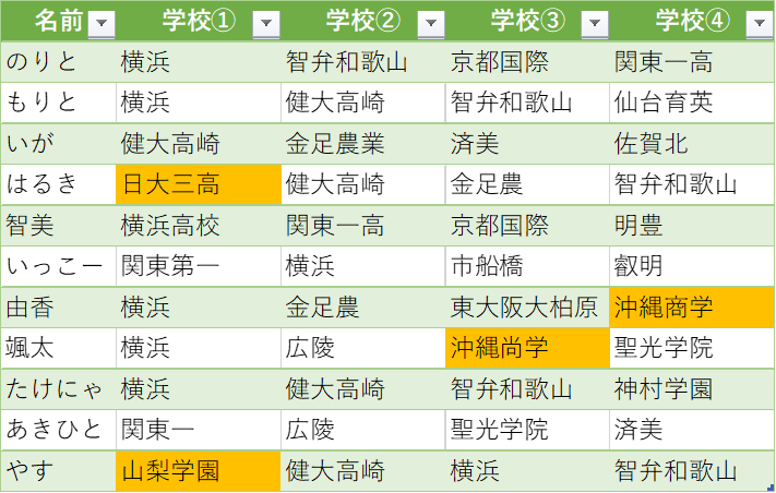この表は参加者が投稿してくれたのを一覧表にしました。オレンジの塗りつぶしがあるのがあたりです。ゆかちゃんの沖縄商学⇒沖縄尚学、やっちゃんの山梨学園⇒山梨学院と誤字がありましたが、どの高校を指しているのかはわかるので、正解とします。