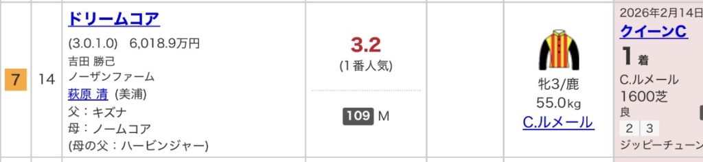 本命はドリームコア。お母さんもG1勝利していて今回はチャンス!瞬発力ある末脚は魅力で入れ込まないでレースを進めて欲しい。