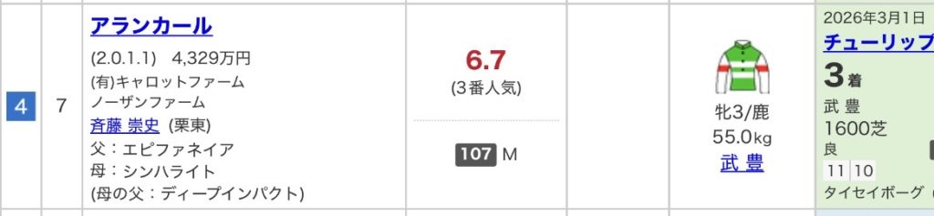 対抗はアランカール。もしかしたら今まで戦ってきた馬がレベルが低いかもしれませんが、馬は使われて良化している印象。人気程、信頼度はありませんがオークスで本領発揮。ここは馬券内に入って優先出走権を確保して欲しい。