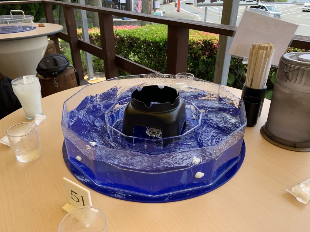 流しラーメン、一人前750円。流しそーめんは青いツユで食べるみたい。なんとなく少...